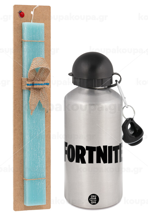 Fortnite landscape, Easter Set, metallic silver aluminum water bottle (500ml) & scented flat Easter candle (30cm) (TURQUOISE)