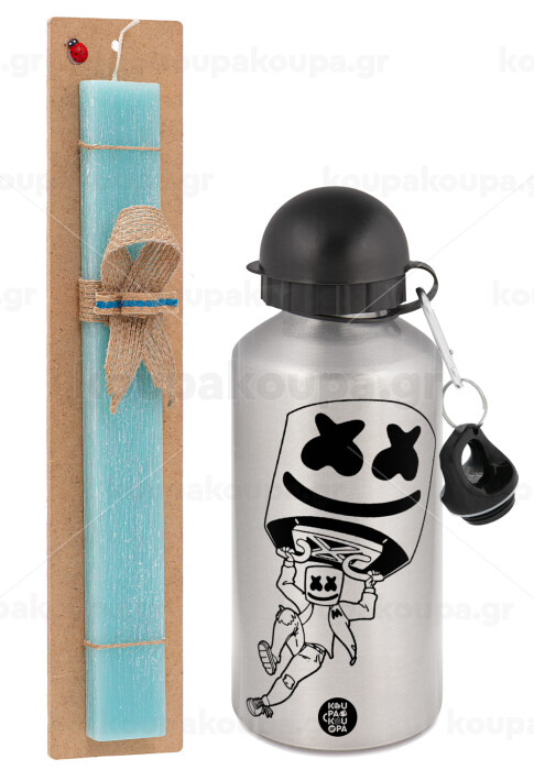 Fortnite Marshmello, Easter Set, metallic silver aluminum water bottle (500ml) & scented flat Easter candle (30cm) (TURQUOISE)