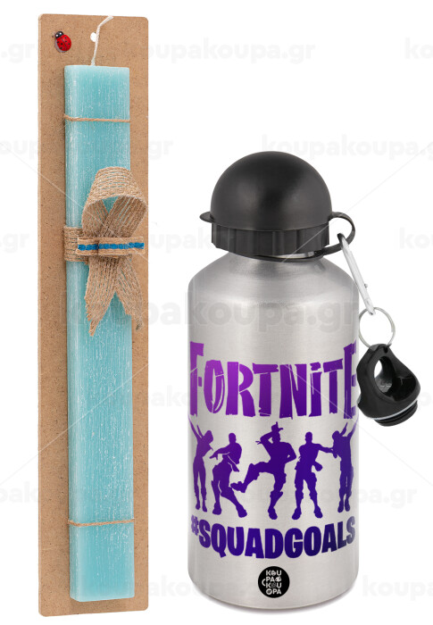 Fortnite #squadgoals, Easter Set, metallic silver aluminum water bottle (500ml) & scented flat Easter candle (30cm) (TURQUOISE)