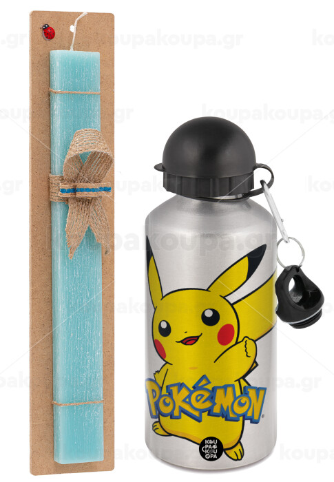 Pokemon pikachu, Easter Set, metallic silver aluminum water bottle (500ml) & scented flat Easter candle (30cm) (TURQUOISE)