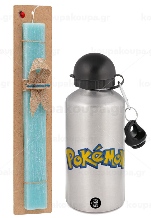 Pokemon, Easter Set, metallic silver aluminum water bottle (500ml) & scented flat Easter candle (30cm) (TURQUOISE)