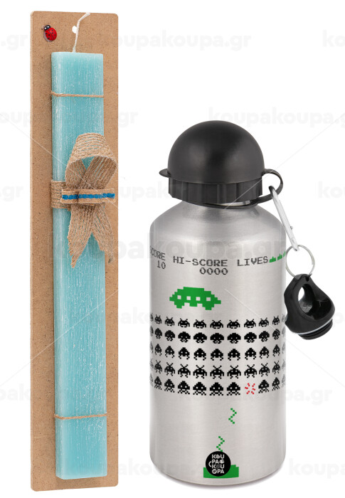Space invaders, Easter Set, metallic silver aluminum water bottle (500ml) & scented flat Easter candle (30cm) (TURQUOISE)