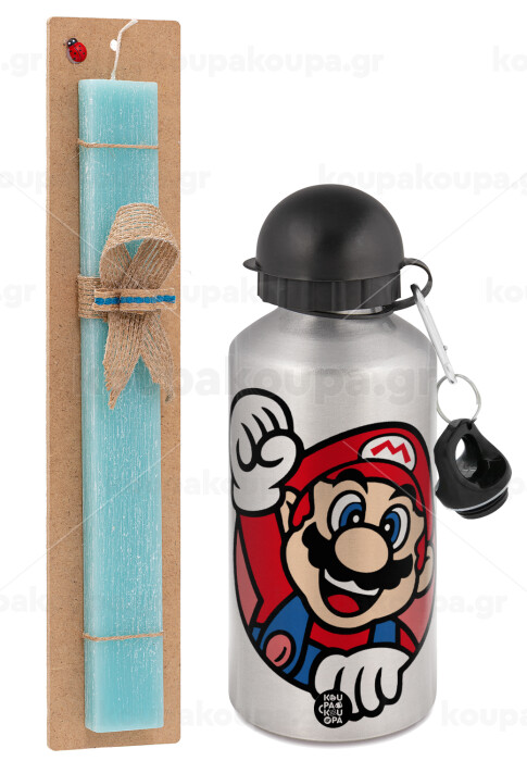 Super mario win, Easter Set, metallic silver aluminum water bottle (500ml) & scented flat Easter candle (30cm) (TURQUOISE)
