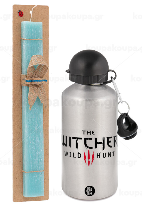 The witcher III wild hunt, Easter Set, metallic silver aluminum water bottle (500ml) & scented flat Easter candle (30cm) (TURQUOISE)