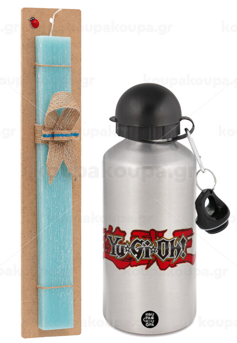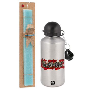 Yu-Gi-Oh, Easter Set, metallic silver aluminum water bottle (500ml) & scented flat Easter candle (30cm) (TURQUOISE)