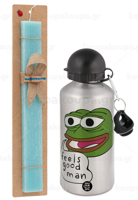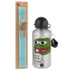 Pepe the frog, Easter Set, metallic silver aluminum water bottle (500ml) & scented flat Easter candle (30cm) (TURQUOISE)