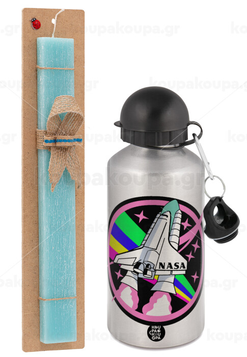 NASA pink, Easter Set, metallic silver aluminum water bottle (500ml) & scented flat Easter candle (30cm) (TURQUOISE)