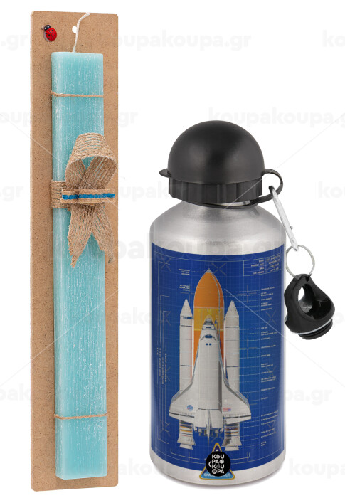 Nasa Space Shuttle, Easter Set, metallic silver aluminum water bottle (500ml) & scented flat Easter candle (30cm) (TURQUOISE)