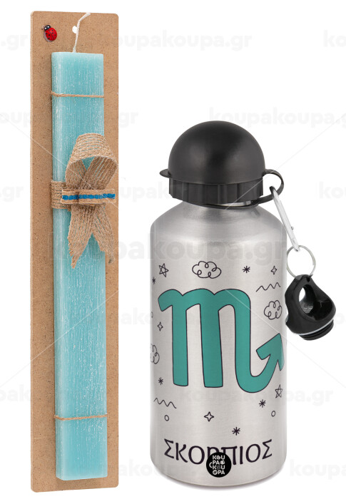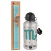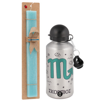 Ζώδια Σκορπιός, Easter Set, metallic silver aluminum water bottle (500ml) & scented flat Easter candle (30cm) (TURQUOISE)