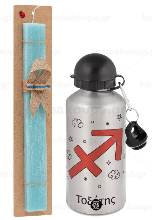Ζώδια Τοξότης, Easter Set, metallic silver aluminum water bottle (500ml) & scented flat Easter candle (30cm) (TURQUOISE)