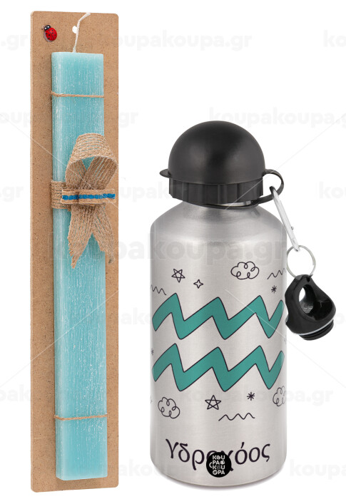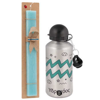 Ζώδια Υδροχόος, Easter Set, metallic silver aluminum water bottle (500ml) & scented flat Easter candle (30cm) (TURQUOISE)