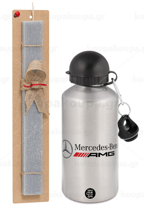 AMG Mercedes, Easter Set, metallic silver aluminum water bottle (500ml) & aromatic flat Easter candle (30cm) (GRAY)