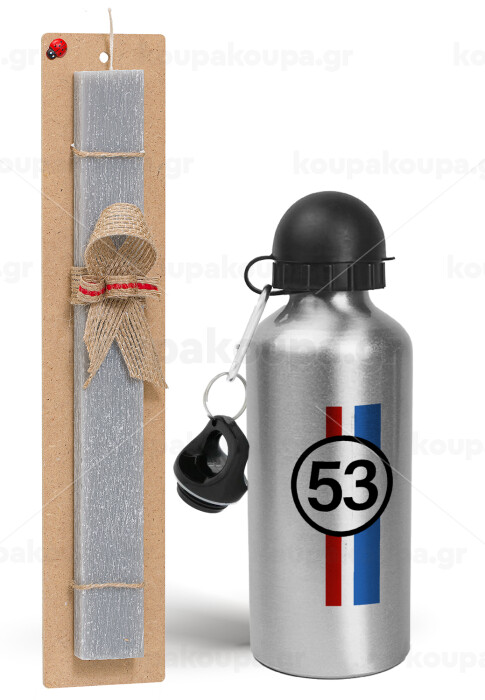 VW Herbie 53, Easter Set, metallic silver aluminum water bottle (500ml) & aromatic flat Easter candle (30cm) (GRAY)