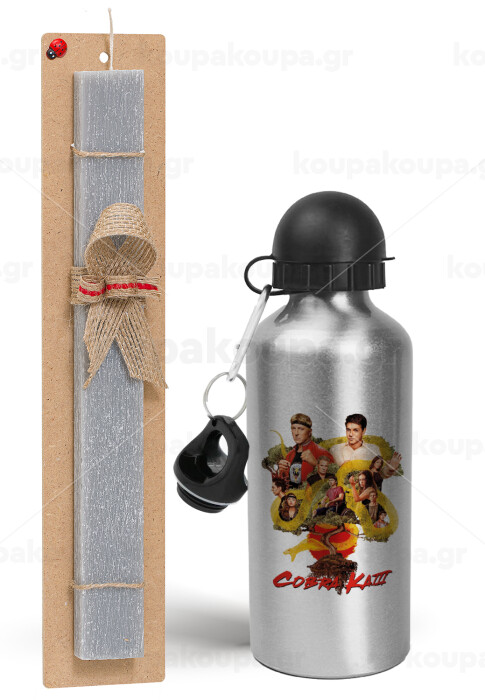 Cobra Kai tree, Easter Set, metallic silver aluminum water bottle (500ml) & aromatic flat Easter candle (30cm) (GRAY)