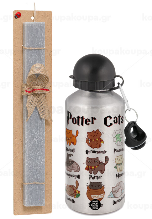 Potter Cats, Easter Set, metallic silver aluminum water bottle (500ml) & aromatic flat Easter candle (30cm) (GRAY)