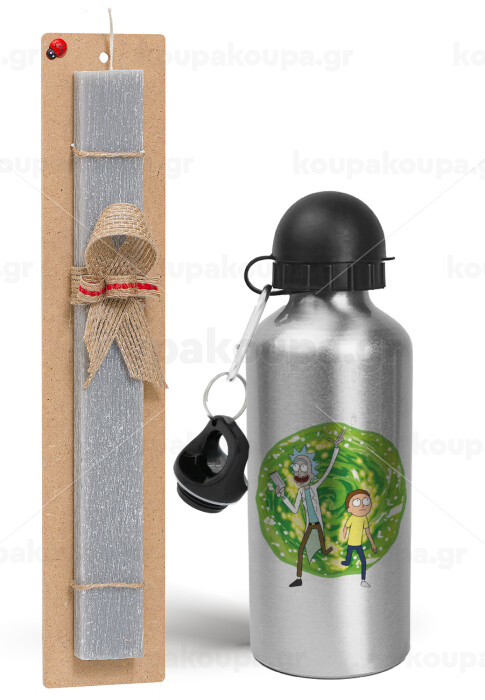 Rick and Morty, Easter Set, metallic silver aluminum water bottle (500ml) & aromatic flat Easter candle (30cm) (GRAY)