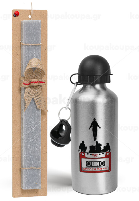 Running up that hill, Stranger Things, Easter Set, metallic silver aluminum water bottle (500ml) & aromatic flat Easter candle (30cm) (GRAY)