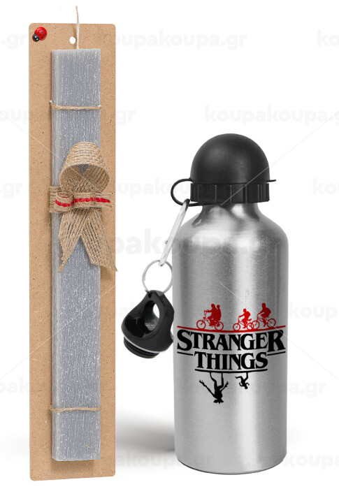 Stranger Things upside down, Easter Set, metallic silver aluminum water bottle (500ml) & aromatic flat Easter candle (30cm) (GRAY)