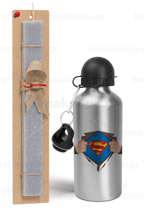 Superman hands, Easter Set, metallic silver aluminum water bottle (500ml) & aromatic flat Easter candle (30cm) (GRAY)