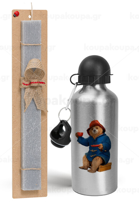 Αρκουδάκι Πάντινγκτον, Easter Set, metallic silver aluminum water bottle (500ml) & aromatic flat Easter candle (30cm) (GRAY)