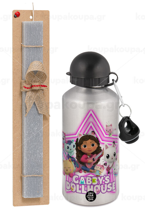 Gabby Dollhouse, Easter Set, metallic silver aluminum water bottle (500ml) & aromatic flat Easter candle (30cm) (GRAY)