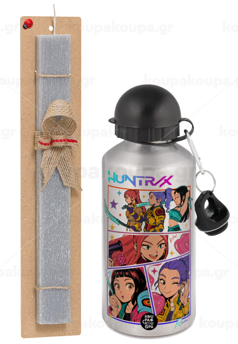 Huntrix Kpop Girls, Easter Set, metallic silver aluminum water bottle (500ml) & aromatic flat Easter candle (30cm) (GRAY)