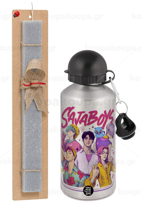 Huntrix Saja Boys, Easter Set, metallic silver aluminum water bottle (500ml) & aromatic flat Easter candle (30cm) (GRAY)