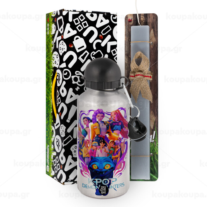 kpop Demon Hunters Huntrix, Easter Set, metallic silver aluminum water bottle (500ml) & aromatic flat Easter candle (30cm) (GRAY)