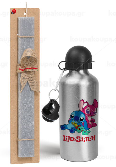 Lilo & Stitch, Easter Set, metallic silver aluminum water bottle (500ml) & aromatic flat Easter candle (30cm) (GRAY)