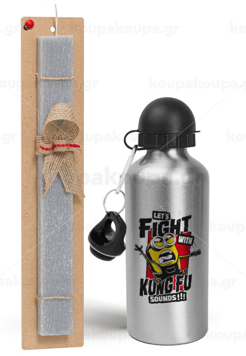 Minions Let's fight with kung fu sounds, Easter Set, metallic silver aluminum water bottle (500ml) & aromatic flat Easter candle (30cm) (GRAY)