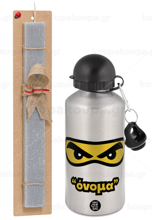 Ninja Eyes με όνομα, Easter Set, metallic silver aluminum water bottle (500ml) & aromatic flat Easter candle (30cm) (GRAY)