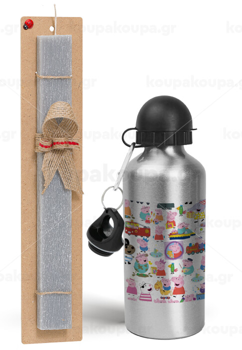 Peppa pig Characters, Easter Set, metallic silver aluminum water bottle (500ml) & aromatic flat Easter candle (30cm) (GRAY)