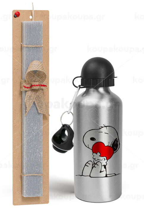 Snoopy, Easter Set, metallic silver aluminum water bottle (500ml) & aromatic flat Easter candle (30cm) (GRAY)
