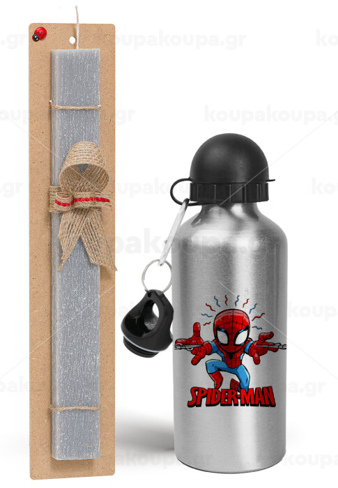 Spiderman flying, Easter Set, metallic silver aluminum water bottle (500ml) & aromatic flat Easter candle (30cm) (GRAY)