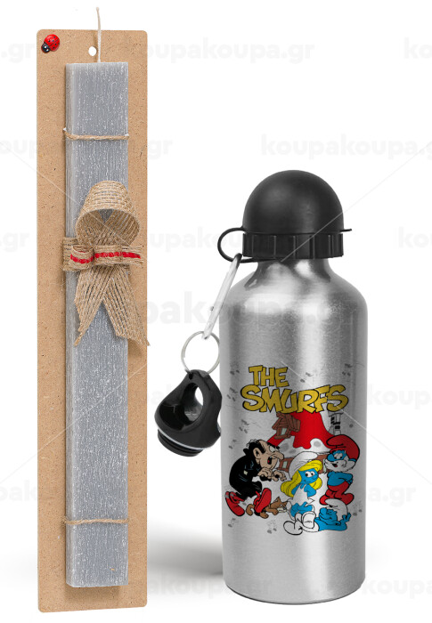 The smurfs, Easter Set, metallic silver aluminum water bottle (500ml) & aromatic flat Easter candle (30cm) (GRAY)