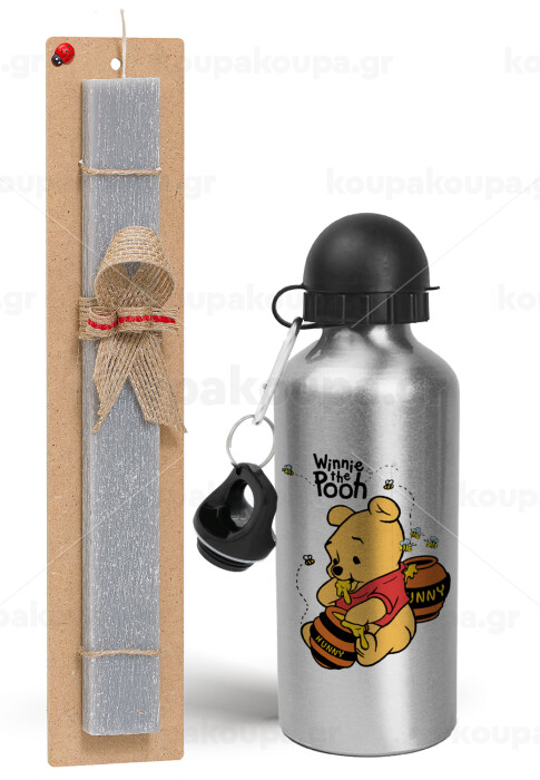 Winnie the Pooh, Easter Set, metallic silver aluminum water bottle (500ml) & aromatic flat Easter candle (30cm) (GRAY)