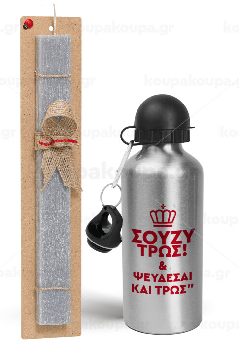 Σούζυ και ψεύδεσαι και τρως, Easter Set, metallic silver aluminum water bottle (500ml) & aromatic flat Easter candle (30cm) (GRAY)