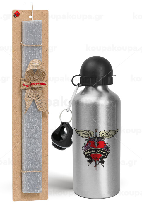 Bon Jovi, Easter Set, metallic silver aluminum water bottle (500ml) & aromatic flat Easter candle (30cm) (GRAY)