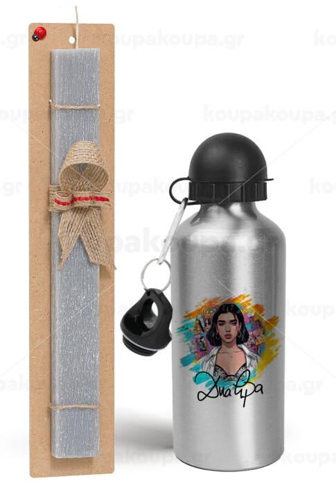 Dua lipa, Easter Set, metallic silver aluminum water bottle (500ml) & aromatic flat Easter candle (30cm) (GRAY)
