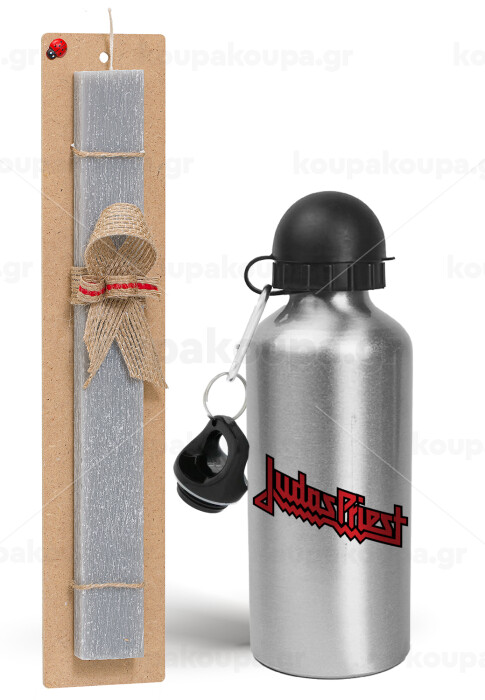 Judas Priest, Easter Set, metallic silver aluminum water bottle (500ml) & aromatic flat Easter candle (30cm) (GRAY)