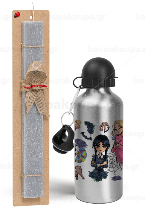 Wednesday and Enid Sinclair, Easter Set, metallic silver aluminum water bottle (500ml) & aromatic flat Easter candle (30cm) (GRAY)