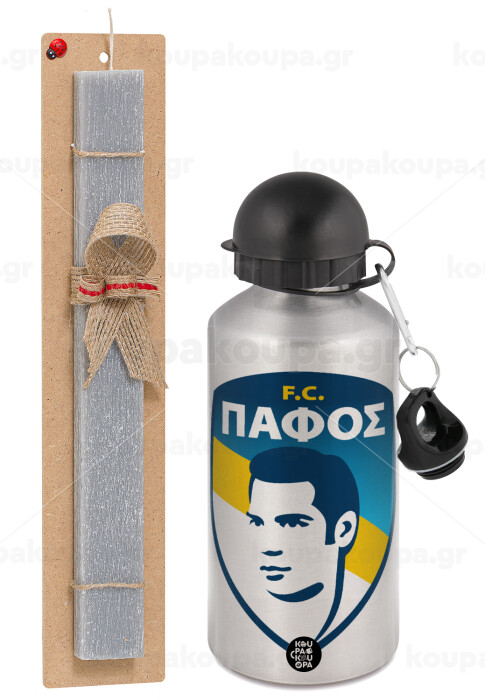 Πάφος FC, Easter Set, metallic silver aluminum water bottle (500ml) & aromatic flat Easter candle (30cm) (GRAY)