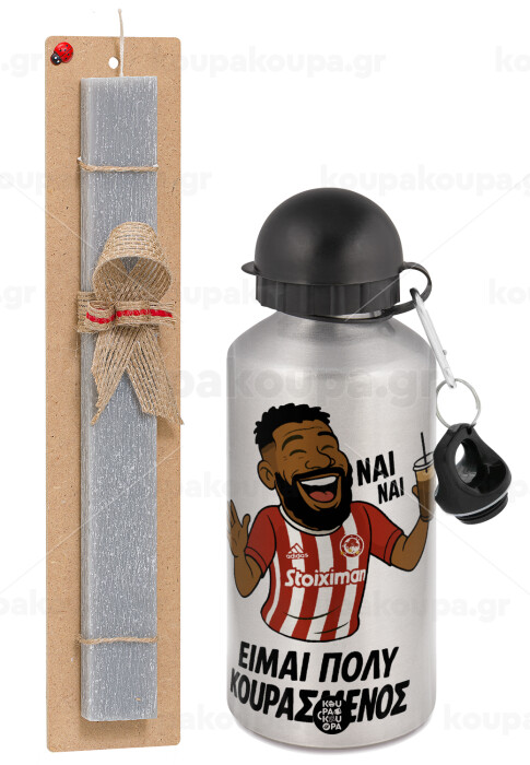 Ροντινέι, "ΠΟΛΥ ΚΟΥΡΑΣΜΕΝΟΣ", Easter Set, metallic silver aluminum water bottle (500ml) & aromatic flat Easter candle (30cm) (GRAY)