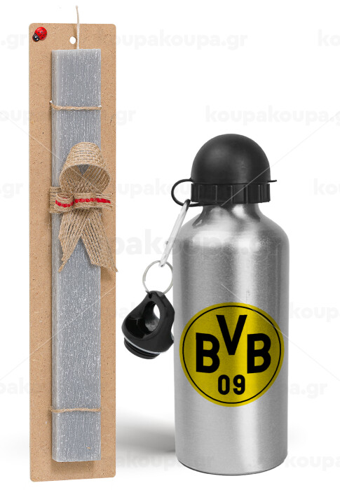 BVB Dortmund, Easter Set, metallic silver aluminum water bottle (500ml) & aromatic flat Easter candle (30cm) (GRAY)