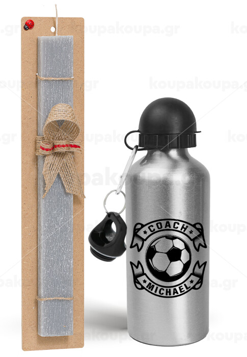 Soccer coach, Easter Set, metallic silver aluminum water bottle (500ml) & aromatic flat Easter candle (30cm) (GRAY)