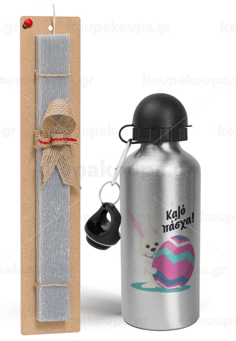 Καλό πάσχα, Easter Set, metallic silver aluminum water bottle (500ml) & aromatic flat Easter candle (30cm) (GRAY)