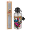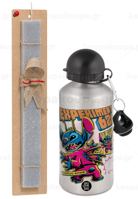 Stitch Experiment 626, Easter Set, metallic silver aluminum water bottle (500ml) & aromatic flat Easter candle (30cm) (GRAY)