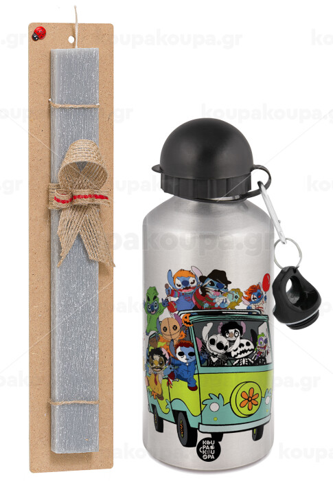 Stitch Halloween scooby car, Easter Set, metallic silver aluminum water bottle (500ml) & aromatic flat Easter candle (30cm) (GRAY)