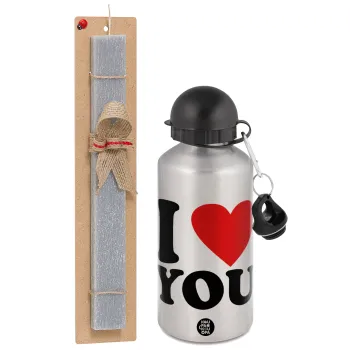 I LOVE YOU, Easter Set, metallic silver aluminum water bottle (500ml) & aromatic flat Easter candle (30cm) (GRAY)