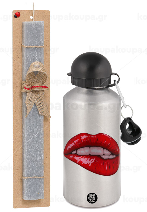 Lips, Easter Set, metallic silver aluminum water bottle (500ml) & aromatic flat Easter candle (30cm) (GRAY)